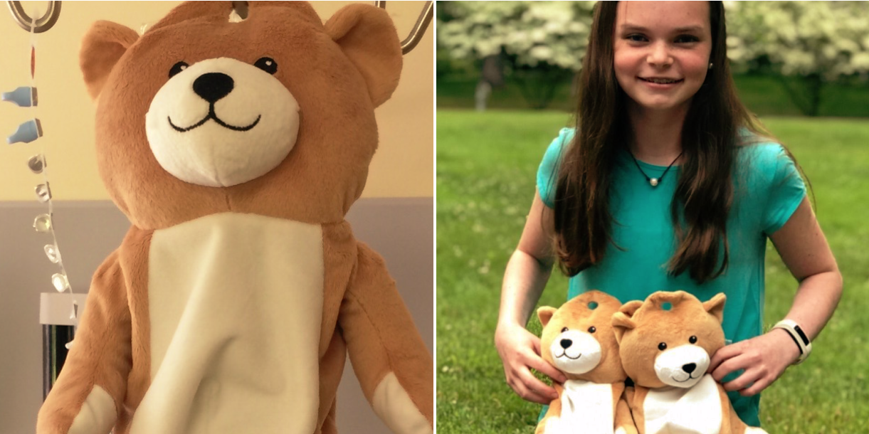 Her invention is called the Medi Teddy, and it looks like a cute teddy bear plush except for a hole in the back designed to hide IV bags or bottles.
