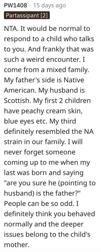 Her parents looked mortified, but neither my husband or myself took offense. She looks about 6-years-old, and children have little to no filter. We also live in a predominantly white European country. I can tell that it came from a place of curiosity rather than from a place of ill-intent.