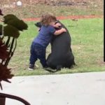 Toddler takes a quick break for a best bud hug